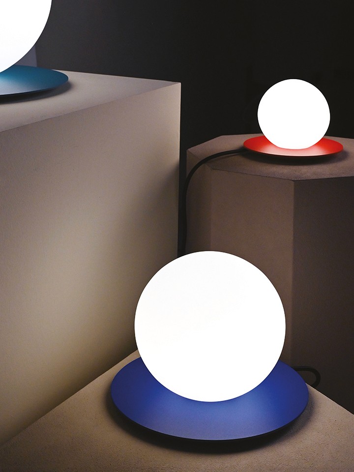 A few carefully chosen elements come together with effortless elegance, creating refined objects where attention to detail is paramount. Blown glass spheres transform into pure light, gently resting on colored metal discs that seem to float in space, while advanced technology operates seamlessly within.