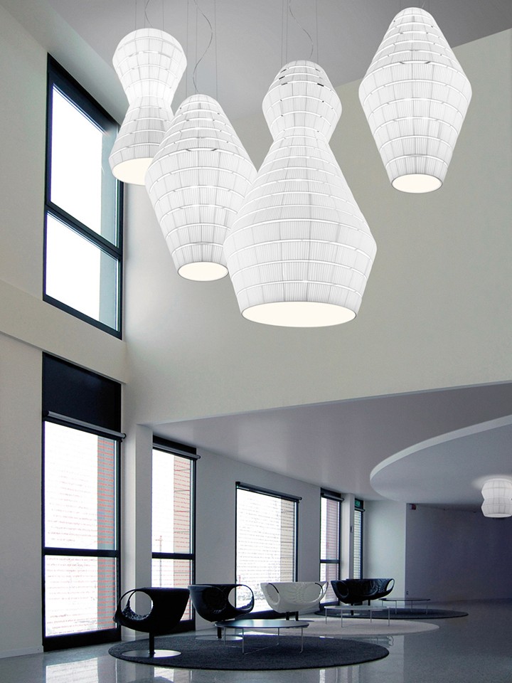 Layers is a collection of suspension lamps with a strong sculptural presence, obtained through combinations of different geometric shapes. Its layered system is modular, which allows you to create different shapes. The distinctive feature of Layers is the breadth of its volumes, but at the same time its lightness, which make this lamp ideal for large spaces. The texture of its fabric and the structure of Layers, as demonstrated by our tests, allow to reduce noise by up to 47%. Being able to count on an Equivalent Absorption Area that reaches a maximum of 5.78, Layers is a sound-absorbing lamp with remarkable performance.