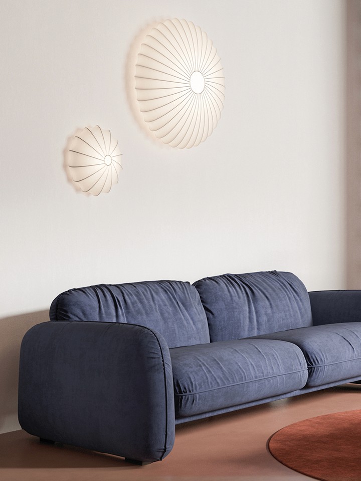 Some design lamps transcend time, remaining as beautiful and contemporary today as when they were first created. Muse is one of them – an architectural element that enhances walls and ceilings. Its metal structure, reminiscent of flower petals, is wrapped in an elastic, interchangeable fabric, blending elegance with versatility.