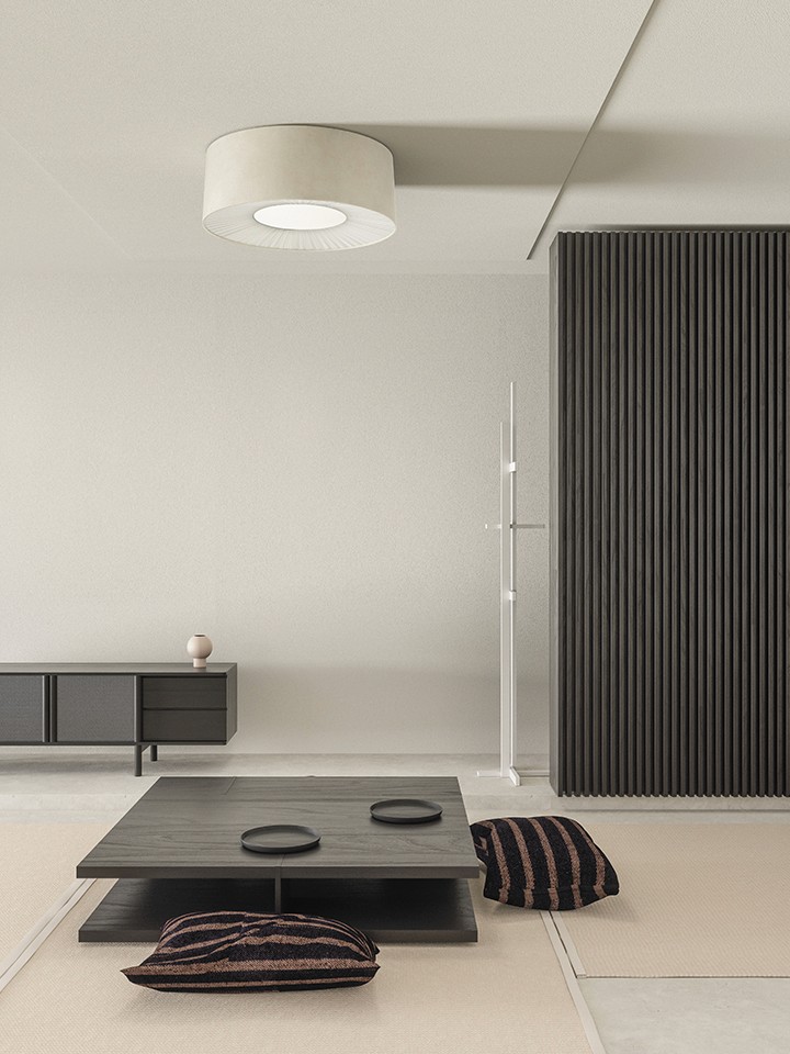 Even in its ceiling version, Velvet maintains its elegance and refinement intact. The simplicity of its geometry is enriched by a sophisticated fabric. The multidimensionality and the multiplicity of colors make Velvet a versatile lamp, adapting to different environments, from the domestic one to the world of hospitality and contract. The visual comfort that Velvet ensures is also combined with the acoustic one, thanks to its fabric that makes it a sound-absorbing solution. Its Equivalent Absorption Area, which reaches a maximum of 2.05, can reduce noise by up to 40%.
