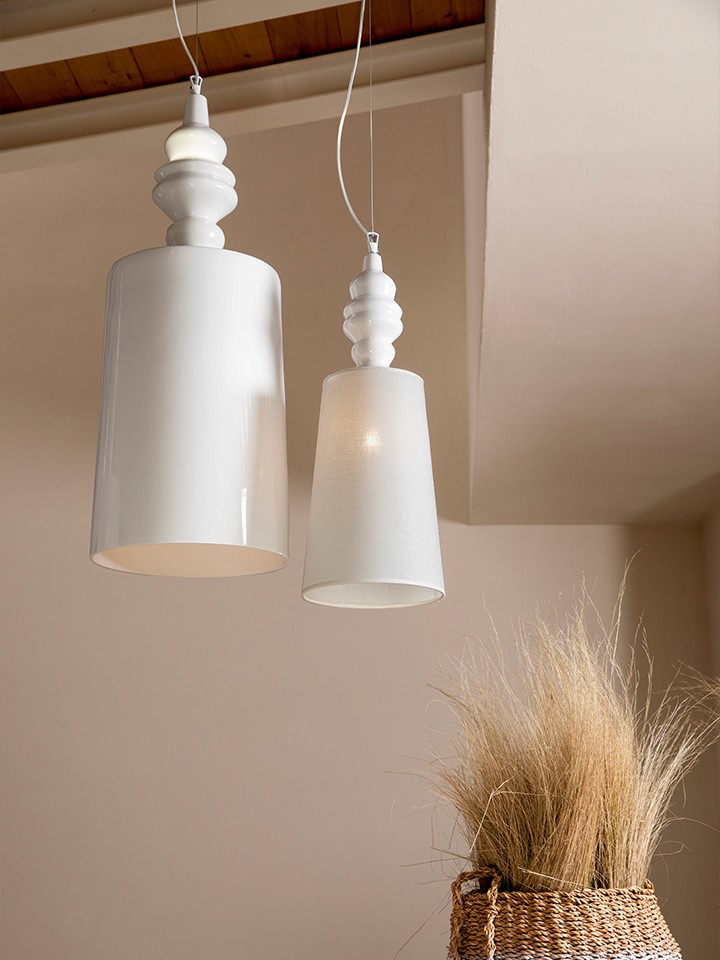 The collection consists of suspension, wall sconces, table versions and wall lamps, whose profile, reminiscent of Persian features, evokes oriental fairy tales. In the applique version, the structure and lampshade are made of ceramic and can be customized in the color of your choice, with a glossy white ceramic or with a white linen lampshade for a more diffused light. This suspension, table and floor lamps are available in two shapes and sizes.