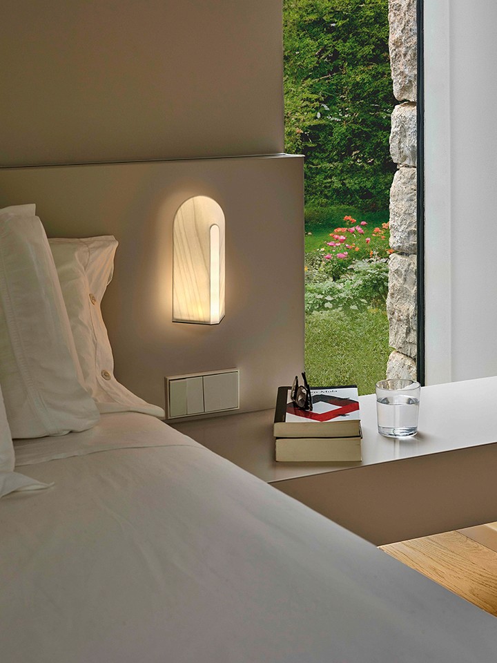 Available in two versions, one with bulb and another with an integrated LED for a more compact format, the collection comes in two sizes. Each model emits a warm, enveloping light, bringing intimacy and character to any architectural setting.