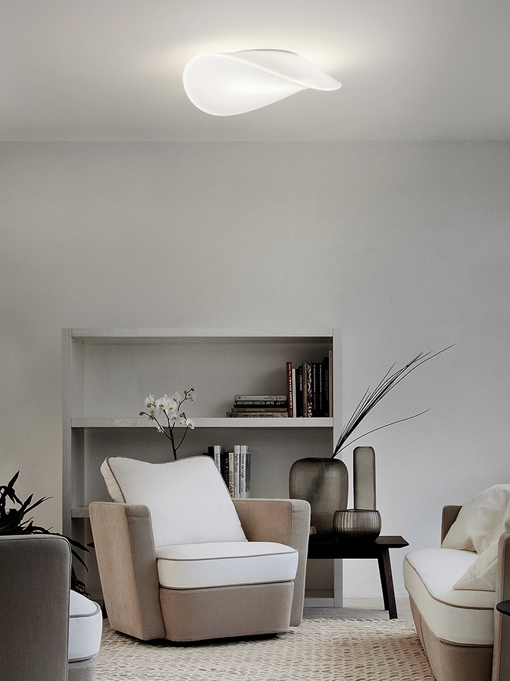 Available as pendant, ceiling or wall lamp. It is the perfect answer for those looking for a large lamp. The diffuser, especially in the bigger size, offers a large lighting surface area despite a minimalist metal frame.
