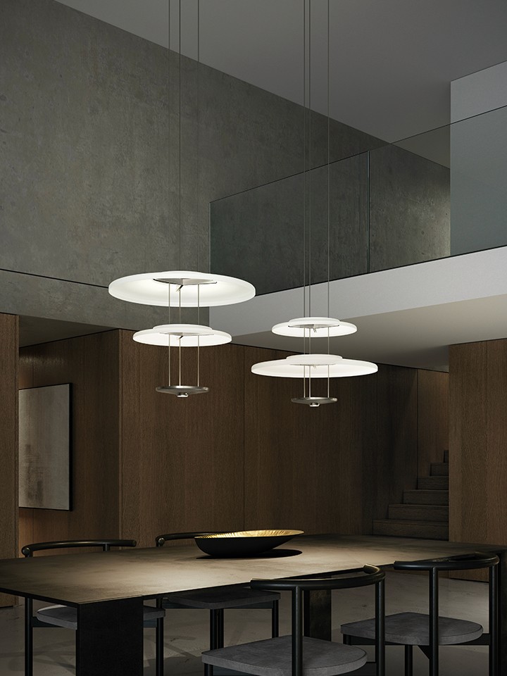 A collection that plays with overlapping glass discs and a metal base housing two LED sources. The first diffuses a warm ambient light, while the second projects directional light onto the surfaces below. The two glass elements can be adjusted in height thanks to a sliding attachment system along the cables, allowing ever-changing configurations, even using a single diffuser.