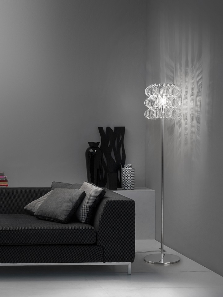 One ring, infinite combinations. The concept of the Ecos collection is just in one element: the glass ring. Extremely customizable in terms of shapes and sizes, for a truly original lighting. Rigadin white or crystal colour glass. Metal parts finishing in satin bronze and chrome.
