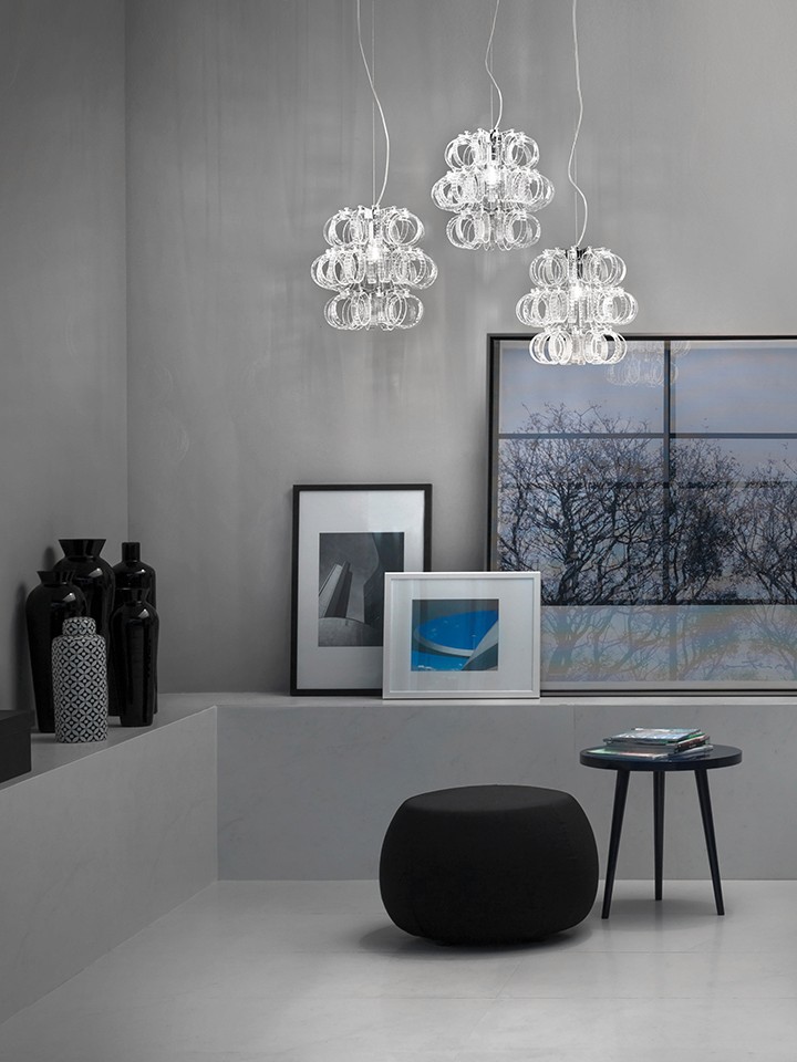 One ring, infinite combinations. The concept of the Ecos collection is just in one element: the glass ring. Extremely customizable in terms of shapes and sizes, for a truly original lighting. Rigadin white or crystal colour glass. Metal parts finishing in satin bronze and chrome.
