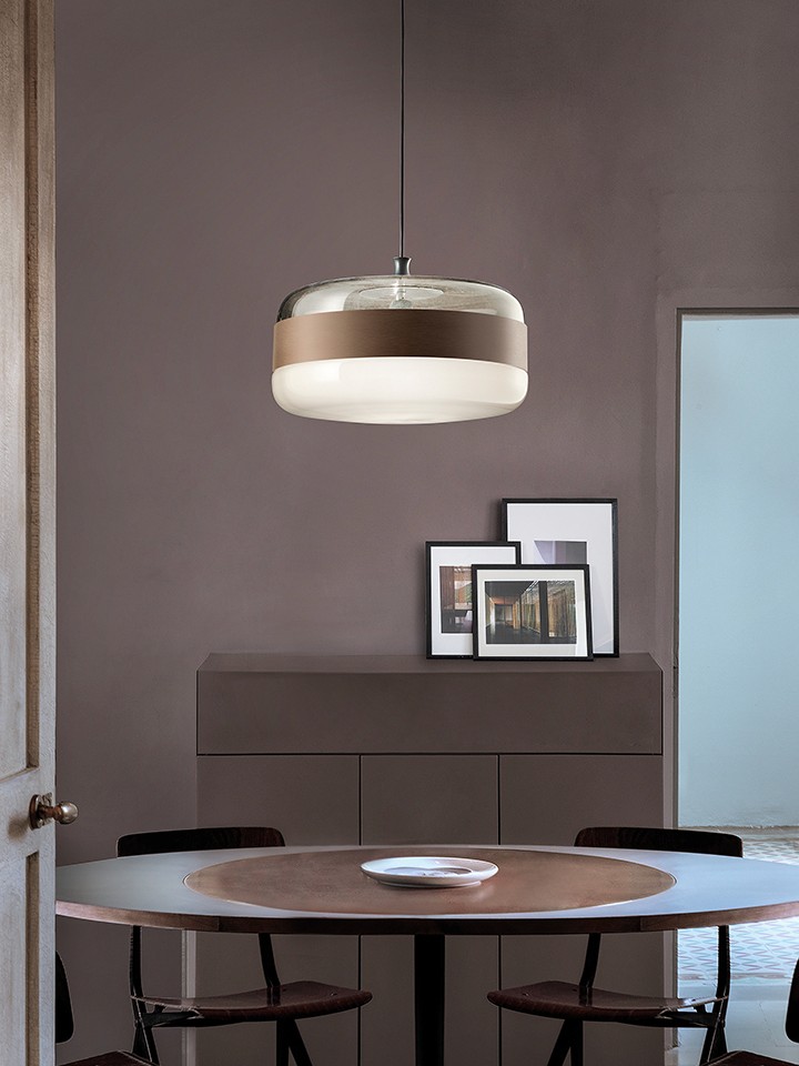 A collection of lamps made from a single piece of blown glass, whose particular workmanship, though, allows a double chromatic effect: transparent at the top, satin effect at the bottom. The following combinations of glass with metal ring are now available: white glass combined with matt black ring, smoky glass with brown ring, amber glass with painted brass ring. A new transparent crystal glass finish with copper or matt black ring.