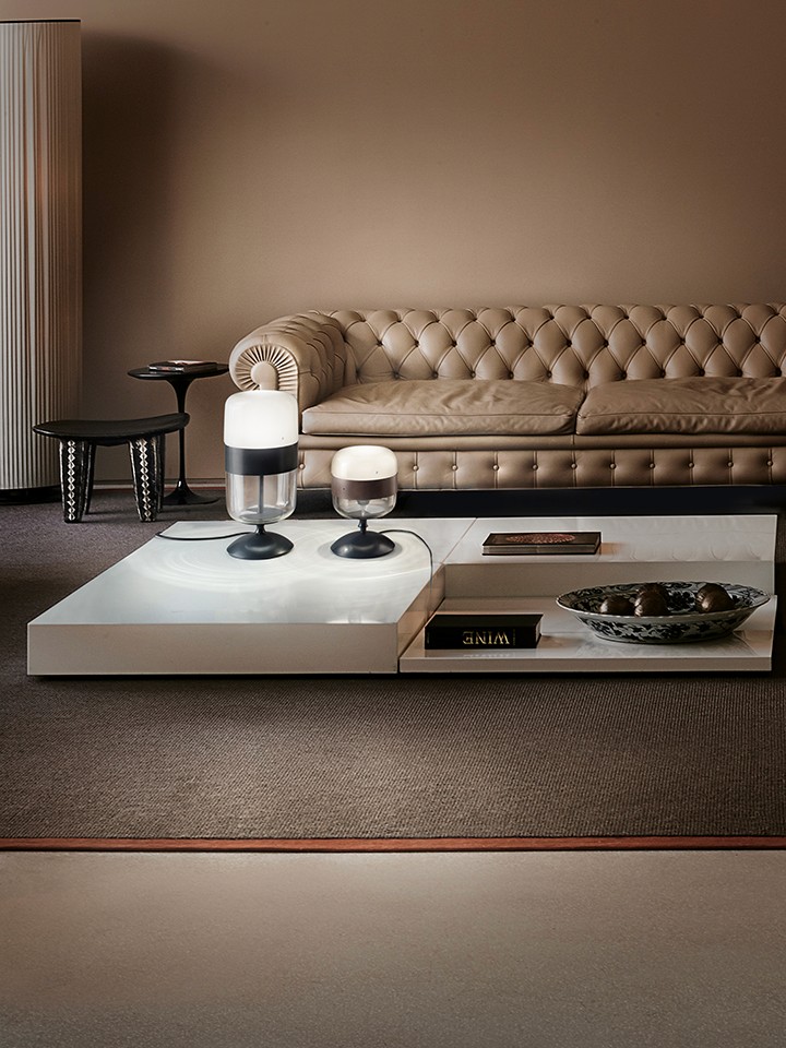 A collection of lamps made from a single piece of blown glass, whose particular workmanship, though, allows a double chromatic effect: transparent at the top, satin effect at the bottom. The following combinations of glass with metal ring are now available: white glass combined with matt black ring, smoky glass with brown ring, amber glass with painted brass ring. A new transparent crystal glass finish with copper or matt black ring.