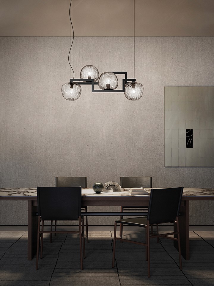 A collection whose originality lies in the visual contrast between the rigid structure and the soft shapes of the blown glass diffusers. The frame features continuous, elegant orthogonal lines, positioning the diffusers to provide 360° illumination. The collection includes two pendant versions—one large, one small—and a wall lamp.