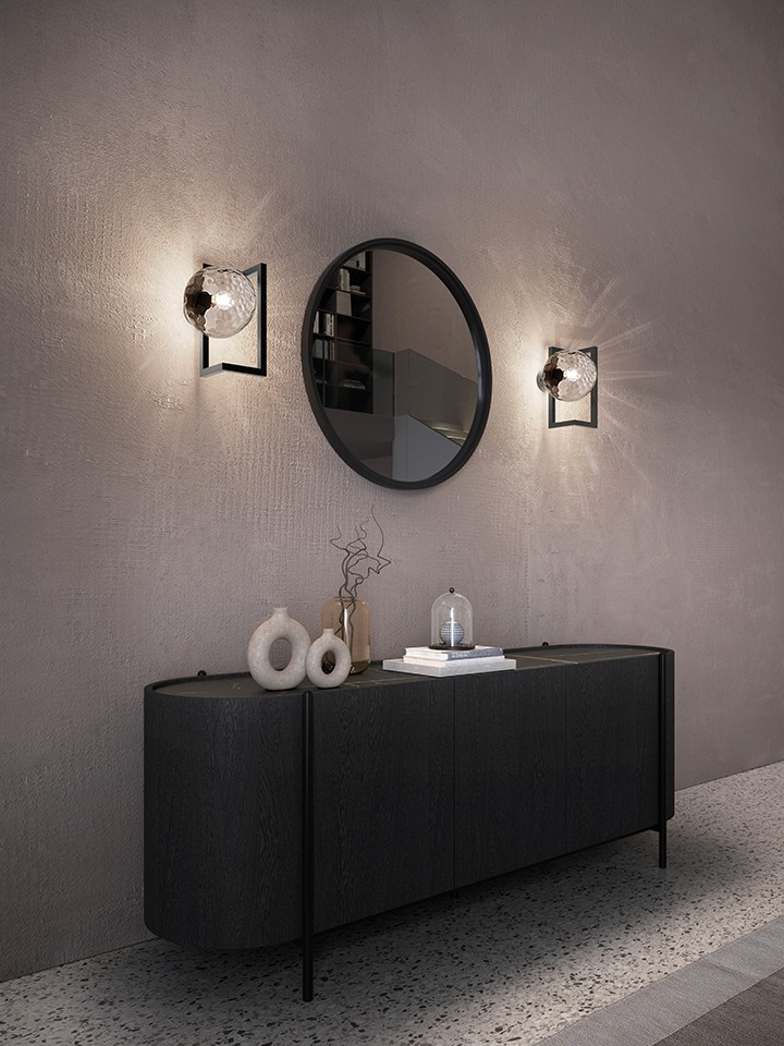 A collection whose originality lies in the visual contrast between the rigid structure and the soft shapes of the blown glass diffusers. The frame features continuous, elegant orthogonal lines, positioning the diffusers to provide 360° illumination. The collection includes two pendant versions—one large, one small—and a wall lamp.