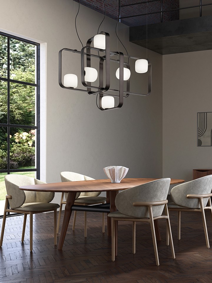 Groove, inspired by the minimalist aesthetics of the 1960s, embodies Mies van der Rohe’s “less is more” philosophy. Designed with geometric precision, it combines rectangular metal frames with soft satin glass spheres, balancing order and warmth. The structure’s sliding frames allow flexible compositions and custom geometries, adapting seamlessly to any space. Available in anthracite or matte bronze finishes, Groove’s modular design and E14 light source make it a refined statement of minimal elegance and timeless architectural harmony.
