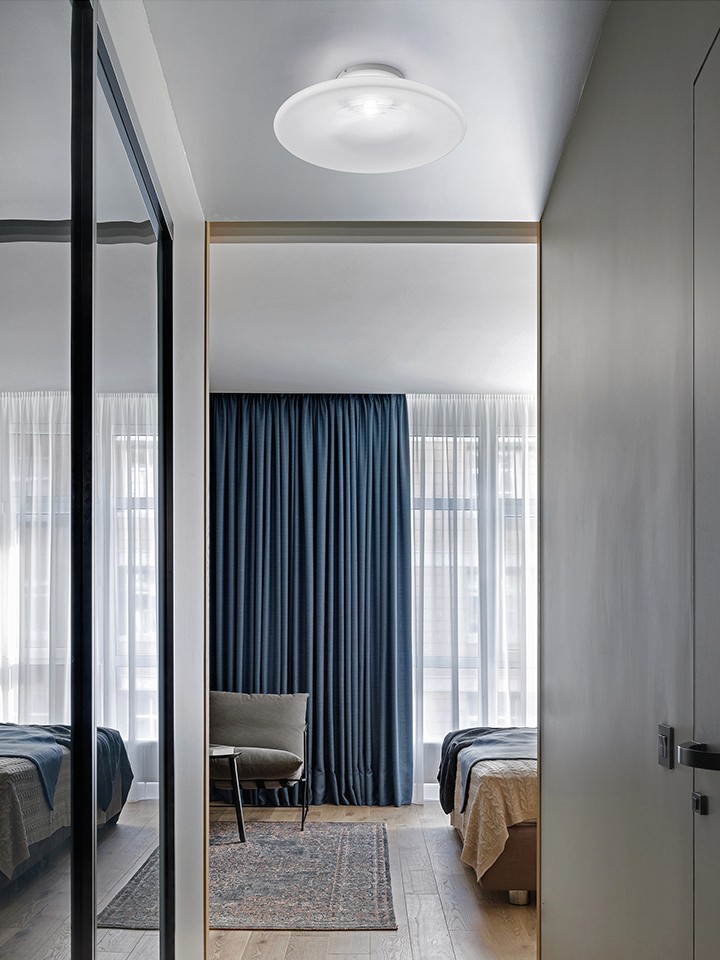 The LED source illuminates the white shaded glass of the pendant and ceiling lamp versions. Neutral tones and simple, elegant lines allow it to be contextualized in environments of different styles. Metal finish in matt white. New pendant and ceiling versions now available.