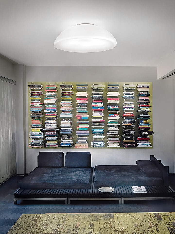 Available in pendant, ceiling and wall versions. It is the perfect answer for those looking for a large lamp. The diffuser, especially in the larger size, offers a large surface area despite an essential metal frame. A new 70 cm size is added to the collection in both ceiling and pendant versions.