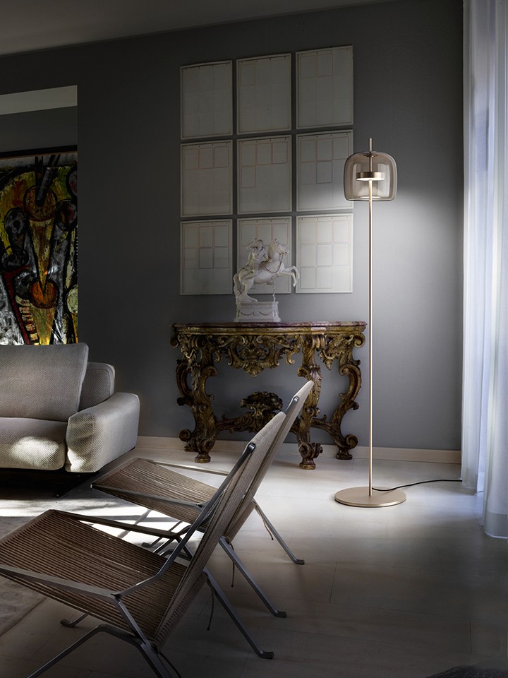 Jube, designed by Favaretto & Partners for Vistosi, reinterprets vintage elegance through refined craftsmanship and contemporary form. Its blown-glass diffusers—available in smoky, burnt earth, old green, crystal, and amethyst—can be paired with an inner white glass layer to create a seamless, luminous whole. Offered as suspension, wall, table, and floor lamps, all with LED sources, Jube features metal finishes in satin gold, satin steel, or matte black, blending tone, texture, and transparency into timeless sophistication.