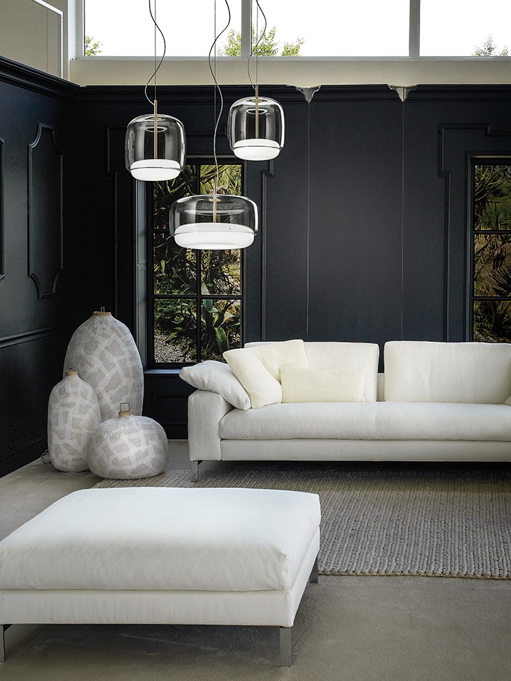 Jube, designed by Favaretto & Partners for Vistosi, reinterprets vintage elegance through refined craftsmanship and contemporary form. Its blown-glass diffusers—available in smoky, burnt earth, old green, crystal, and amethyst—can be paired with an inner white glass layer to create a seamless, luminous whole. Offered as suspension, wall, table, and floor lamps, all with LED sources, Jube features metal finishes in satin gold, satin steel, or matte black, blending tone, texture, and transparency into timeless sophistication.