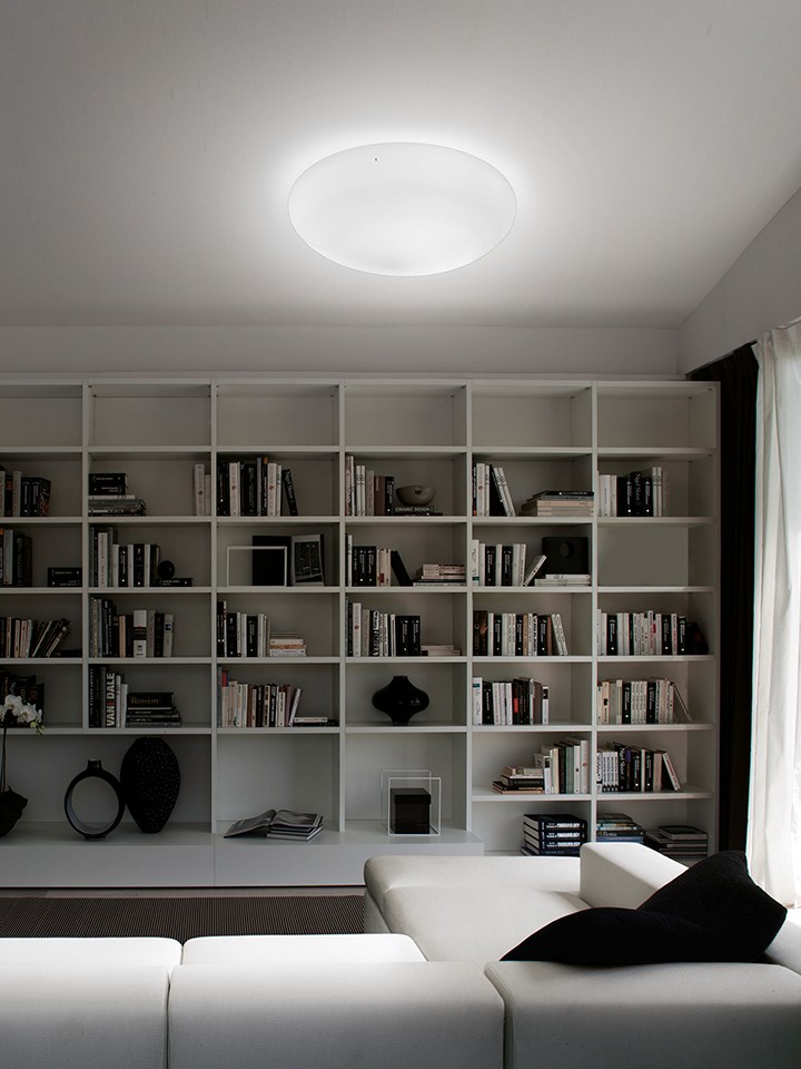 The ceiling lamp is characterized by a simple line, gently rounded at the top. It provides an excellent adhesion to the support, thanks to the frame that minimizes the distance from the ceiling.