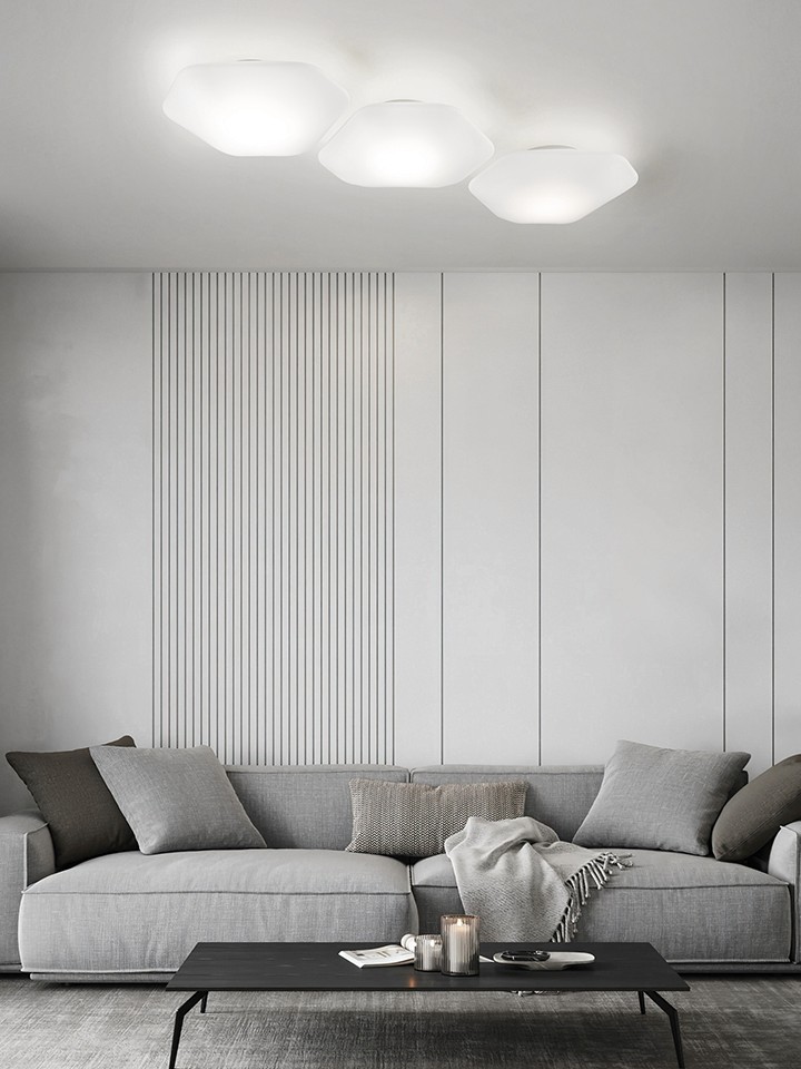 Modulor, designed by Pio and Tito Toso for Vistosi, transforms the purity of blown glass into modular geometry. Its hexagonal form, available in two sizes, can be arranged in endless wall or ceiling compositions or displayed individually as a sculptural light. The beveled glass and reduced frame create a seamless, elegant presence, while the integrated LED provides soft, uniform, and glare-free illumination. Crafted with exceptional thinness, Modulor harmonizes modern precision with timeless craftsmanship.