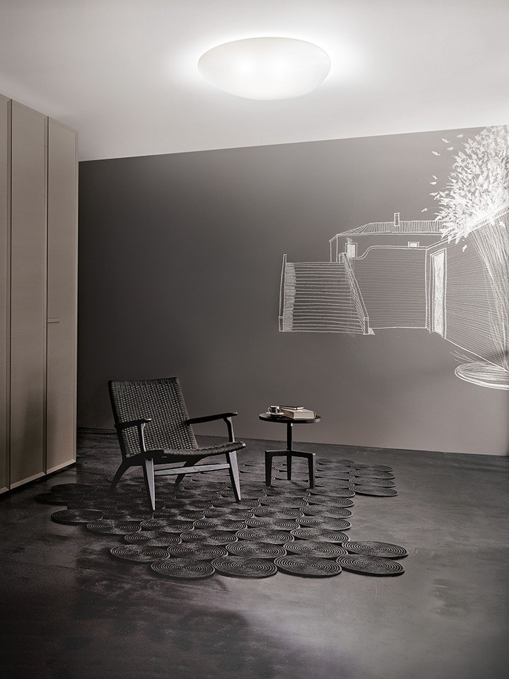 Soft curves and a polished surface meet blown glass in a model of extreme simplicity, suitable for any context.