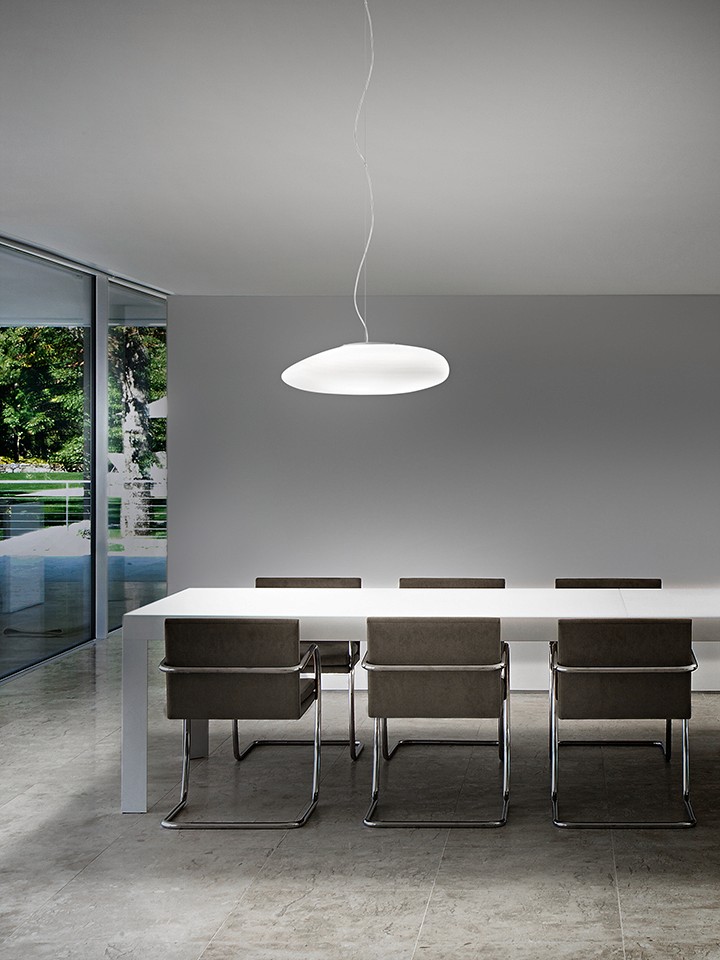 Soft curves and a polished surface meet blown glass in a model of extreme simplicity, suitable for any context.