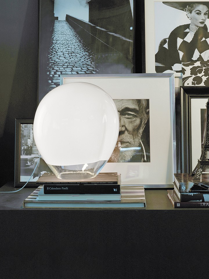 A table lamp essential in its form, precious for its craftsmanship. The transparent lower band makes the most of the light source, while the rest of the white glass body lets in a light that is perfect for relaxing environments.