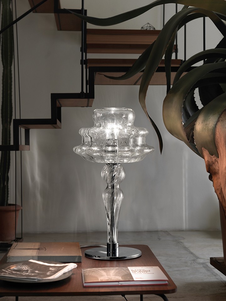 The shape of this collection stems from the desire to reinterpret the traditional Murano chandelier. The choice of the crystal or white rigadin glass finish was the master’s touch: its radial stripes evoke the arms of the historic candlestick while maintaining a contemporary flavour.