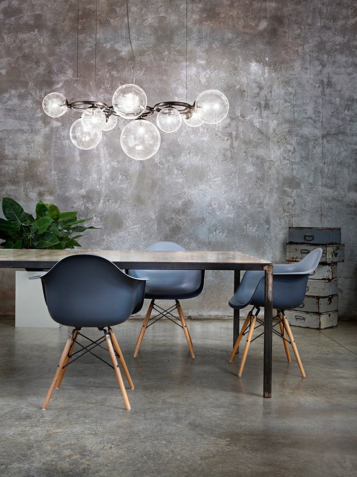 The Puppet Ring collection is based on the idea of creating a frame by combining rings with different diameters, on which crystal balls in three sizes are mounted. Extremely light and elegant, Puppet Ring ethereally combines crystal, smoked, amber and shaded white glass with gold and matt black nickel finishes. The collection has been enriched with two new pendants lamps whose large dimensions make them suitable for large spaces.
