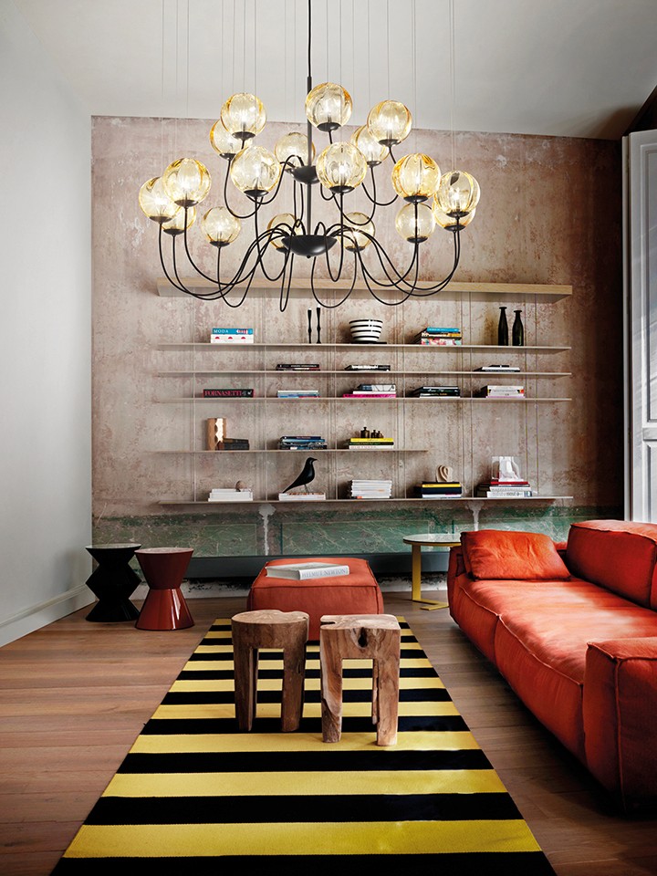Puppet, designed by Romani Saccani Architetti Associati for Vistosi, is a poetic fusion of craftsmanship and purity. Its hand-blown glass spheres—irregularly striped using an ancient Murano technique—radiate warmth and depth. Available as pendant, wall, or table lamps, Puppet features diffusers in soft white, crystal, smoke, or amber glass with chrome or black frames. The chandelier version, suspended by steel cables, allows dynamic compositions, while the Puppet Ring variant introduces elegant circular frames for grand, sculptural lighting installations.
