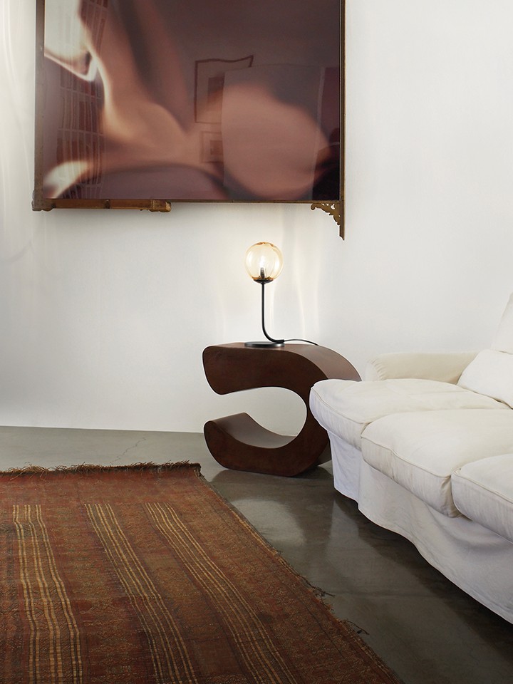 Puppet, designed by Romani Saccani Architetti Associati for Vistosi, is a poetic fusion of craftsmanship and purity. Its hand-blown glass spheres—irregularly striped using an ancient Murano technique—radiate warmth and depth. Available as pendant, wall, or table lamps, Puppet features diffusers in soft white, crystal, smoke, or amber glass with chrome or black frames. The chandelier version, suspended by steel cables, allows dynamic compositions, while the Puppet Ring variant introduces elegant circular frames for grand, sculptural lighting installations.