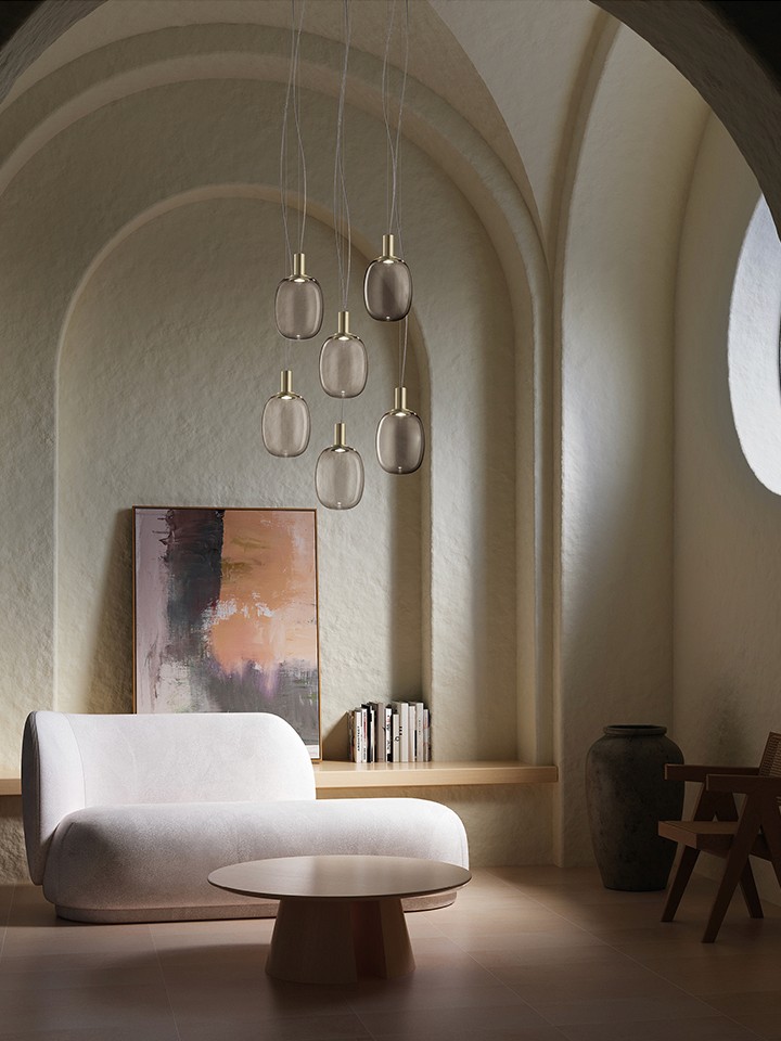 Riflesso, designed by Chiaramonte & Marin for Vistosi, celebrates the purity and lightness of glass through three fluid, bubble-like forms. Its diffusers, available in crystal, pink, amber, or smoked glass, seem to disappear—revealing light as the true protagonist. The pendant’s dual LED source, positioned at both top and base, enhances brilliance and diffusion. Offered in gold or satin copper finishes, Riflesso adapts to any space, from home to office, blending timeless elegance with functional luminosity.