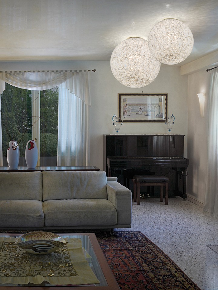 Rina is inspired by the dandelion, of which it recalls the pappus, thanks to the light texture of the surface, made with the traditional technique of murrine. It is available in different sizes that can be combined in a wide range of installations.