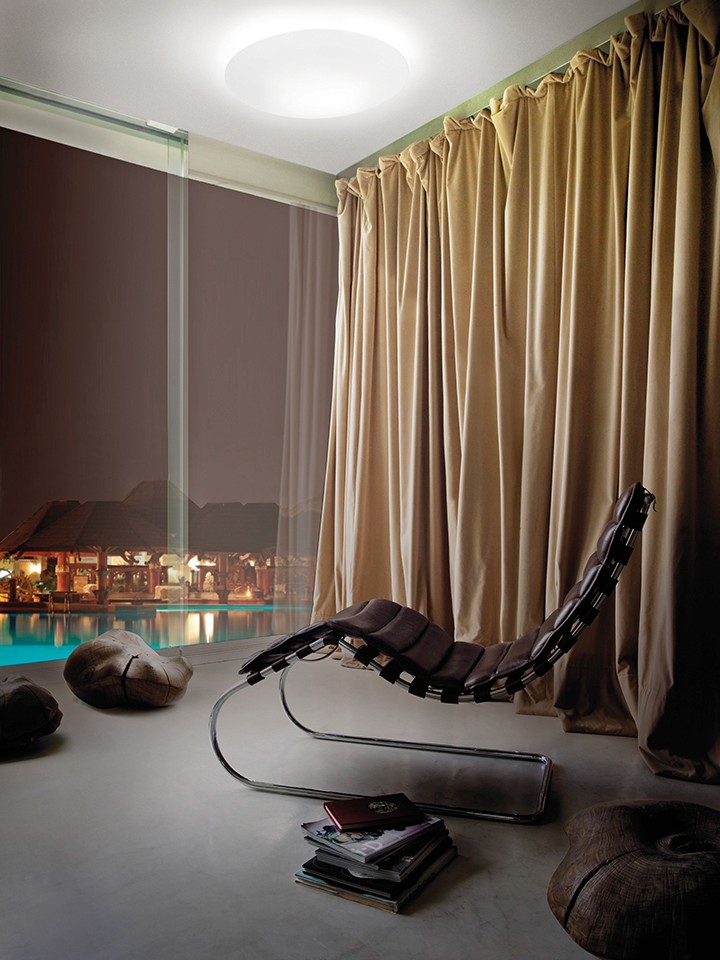 Available in four sizes, Saba is a ceiling or wall lamp. The lens shape of the diffuser in matt white blown glass makes it perfect for lighting.