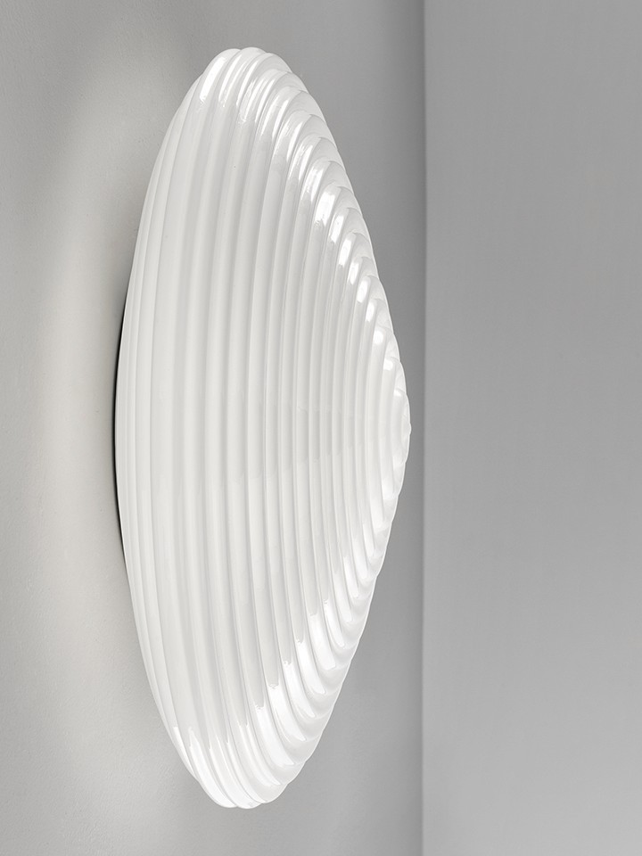 Sprit has the shape of a diamond blown into glass. Its folds are the result of a long process of development that creates a unique light reflection, while keeping the source of light hidden even in the transparent crystal version.