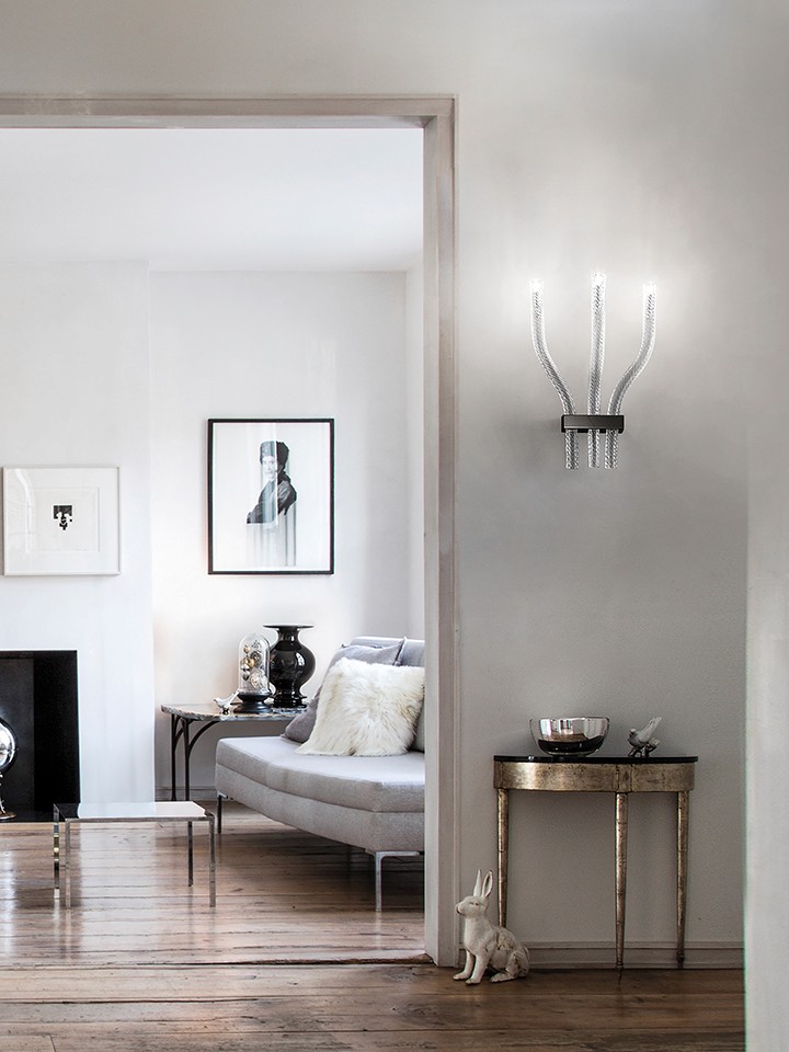 Collections of lamps with arms made of blown and handcrafted crystal glass. The metal frames hide an original fastening system of the arms and of the cabling system.