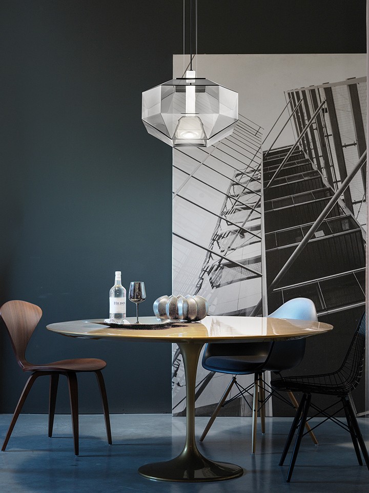 Stone is characterized by almost sculpted volumes, where the lightness of blown glass contrasts with the solidity of linear geometries. In this counterpoint, between the use of a material naturally tending to round shapes, and a rigorous design requiring edges and orthogonal lines, the balance of a bright, original composition is expressed. LED light source.