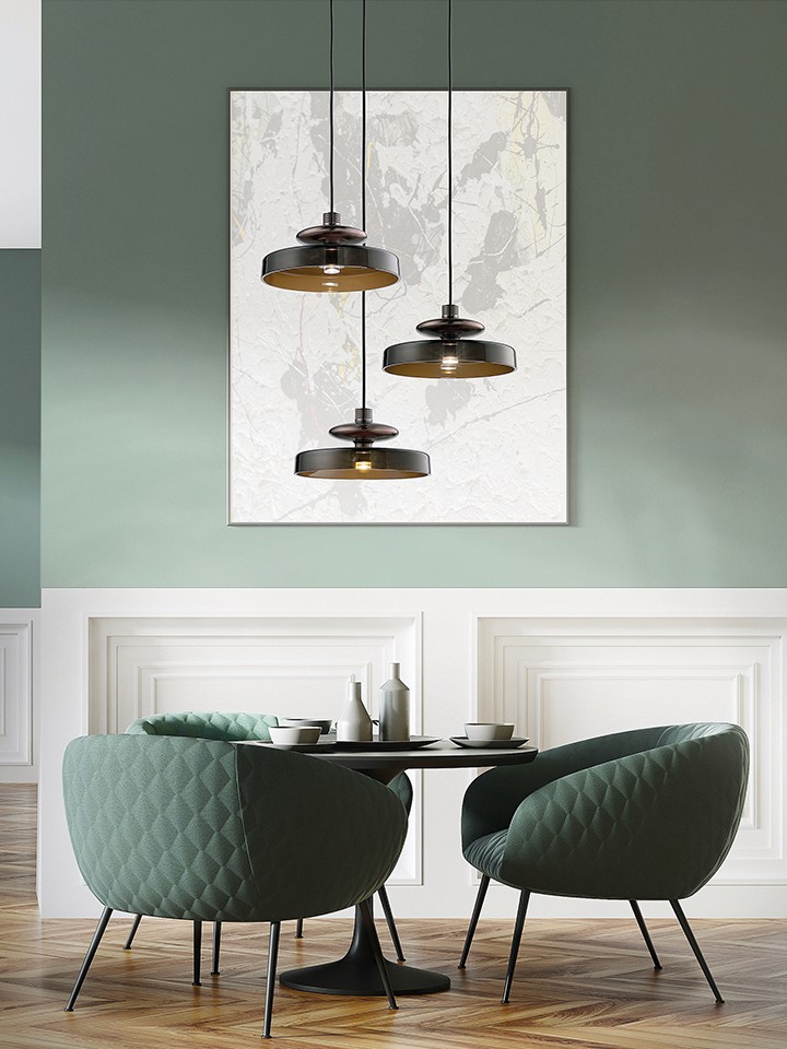 Tread by Chiaramonte & Marin for Vistosi merges industrial charm with artisanal finesse. Its finned metal heat sink and blown glass diffuser evoke vintage electrical design, available in crystal, smoke, burnt earth, or antique green glass paired with copper, gold, or satin bronze finishes. The new pendant version introduces a smooth, wide glass diffuser that replaces the grooved original, offering a modern reinterpretation. With its open base, Tread emits uniform, warm light, creating a bold, avant-garde focal point for any space.